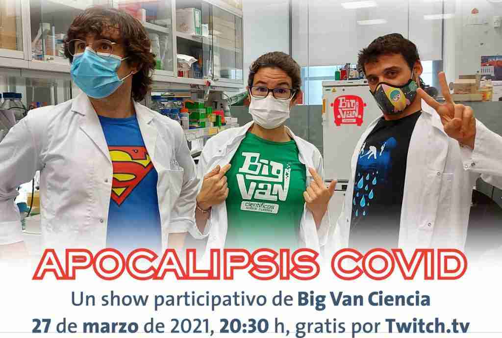 Ya tenemos plan para la tarde-noche del sábado 27 de marzo. Planazo. Espectáculo de humor y ciencia a las 20:30 horas, en directo por Twitch.tv. Asistimos nada menos que, gratis y sin inscripción previa, al estreno de ‘Apocalipsis Covid’, una producción loca loca de Big Van Ciencia y D+i con Helena González-Burón, Ricardo Moure y Oriol Marimón y… alguna sorpresa. Para empezar, “¿quién iba a imaginar que meter un murciélago en una sopa iba a traer un apocalipsis como el que estamos viviendo?”