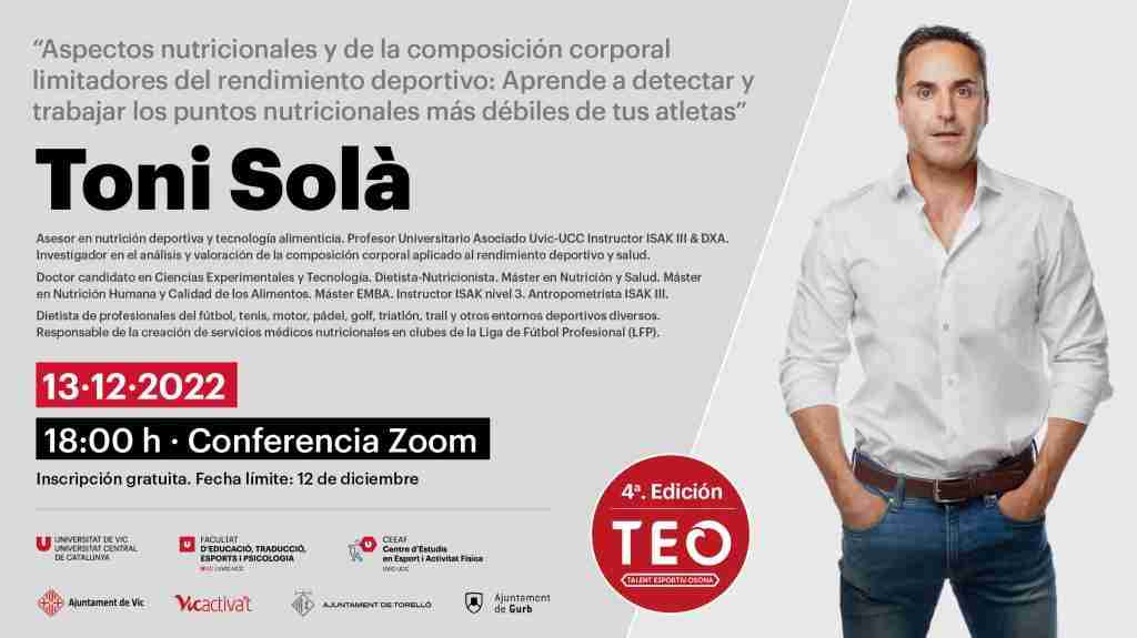 Conferencia enmarcada en la 4ª edición del proyecto de transferencia de conocimiento Talento Deportivo Osona (TEO), a cargo de Toni Solà, dietista de profesionales del fútbol, tenis, motor, pádel, golf, triatlón, trail y otros entornos deportivos diversos. Responsable de la creación de servicios médicos nutricionales en clubes de la Liga de Fútbol Profesional (LFP).