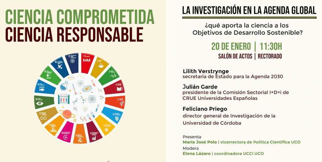 La Secretaria de Estado para la Agenda 2030, Lilith Vestrynge, será la encargada de abrir el próximo viernes 20 de enero el primero de los tres debates del ciclo “Ciencia comprometida, ciencia responsable” con el que la Universidad de Córdoba pretende analizar la responsabilidad social de la actividad investigadora. En este primer encuentro, Vestrynge, junto al presidente de la Sectorial de I+D+i de Crue Universidades Españolas, Julián Garde, y el director general de Investigación de la UCO, Feliciano Priego, reflexionarán sobre el rol que la comunidad investigadora juega en la consecución de los Objetivos de Desarrollo Sostenible (ODS), marcados por la ONU como metas globales en el año 2030.