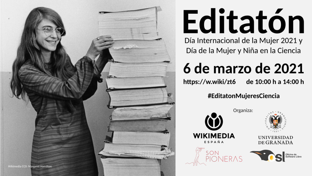 En el marco del 8M y del Día de la Mujer y la Niña en la Ciencia, la Oficina de Software Libre de la UGR en colaboración con el proyecto “Son Pioneras”, organiza el “Editatón Mujeres en la Ciencia” el sábado 6 de marzo, de 10 a 14 horas, con la colaboración de Wikimedia España.