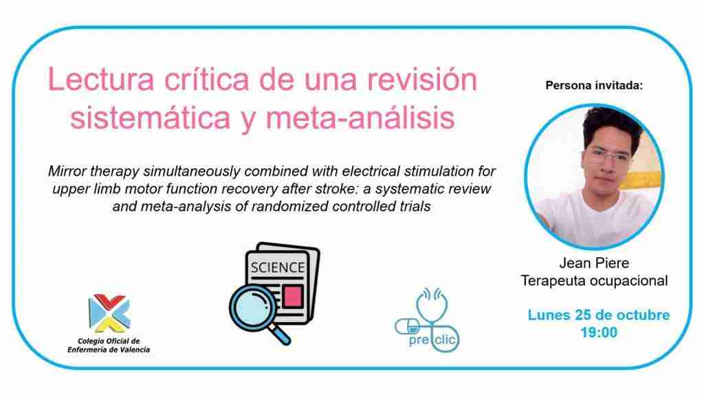 Este próximo 25 de octubre de 2021 a las 19:00 horas (UTC+1) nos enfrentaremos a una revisión sistemática (de autores españoles). Como invitado en #LaCritiquerie tendremos a Jean Piere que vuelve a visitarnos con una nueva propuesta relacionada con la rehabilitación del ICTUS. Se trata de una revisión sistemática sobre la terapia espejo y la estimulación eléctrica usadas en combinación o de forma aislada.