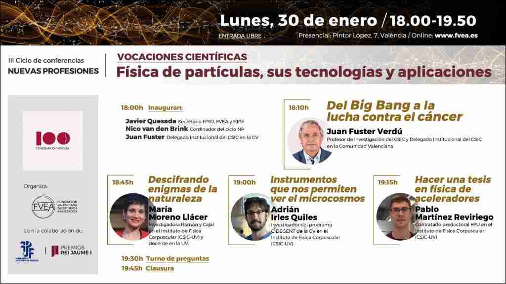 El III Ciclo de Conferencias Nuevas Profesiones: Vocaciones científicas, organizado por la Fundación Valenciana de Estudios Avanzados (FVEA), es la primera jornada del año estará dedicada a las vocaciones científicas dentro de la serie Nuevas Profesiones. En esta ocasión, la física de partículas, sus tecnologías y aplicaciones centrarán la charla en la que Juan Fuster, María Moreno, Adrián Irles y Pablo Martínez, miembros del Instituto de Física Corpuscular (IFIC), hablarán de las vocaciones por la ciencia.