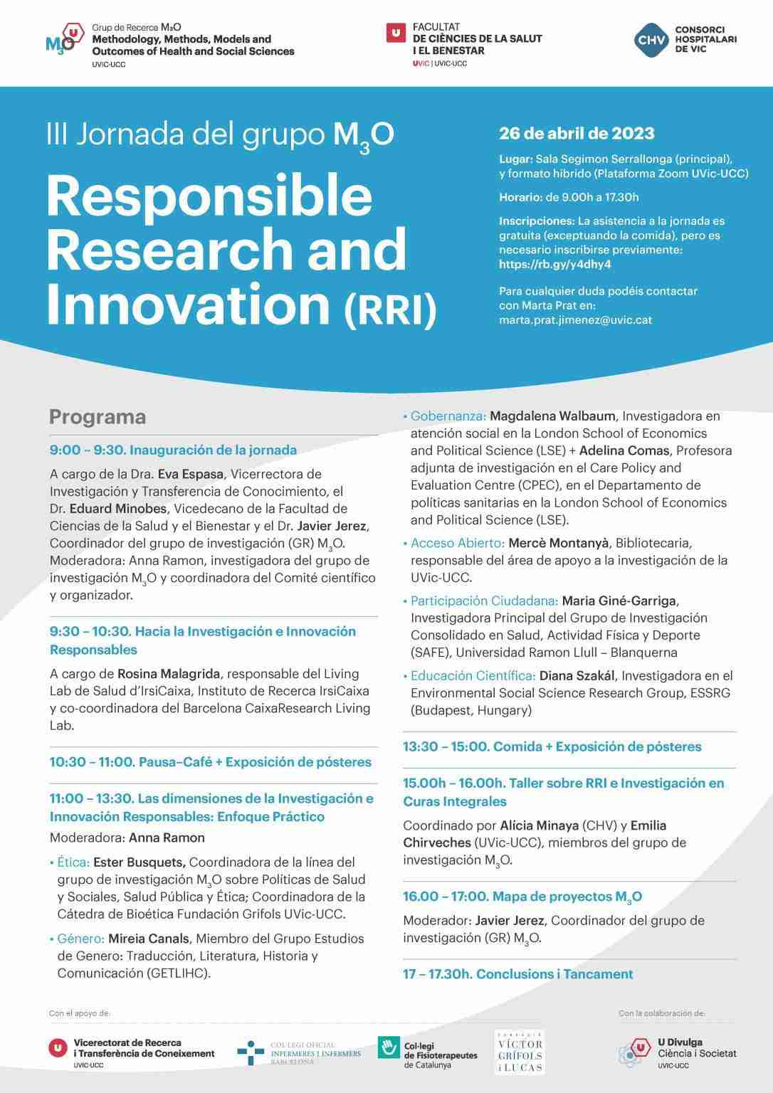 El día 26 de abril tendrá lugar la III Jornada del Grupo de Investigación M₃O. Será en formato híbrido, de las 9h a las 17:30h, en la Sala Segimon Serrallonga de la Universidad de Vic-Universitat Central de Catalunya y online vía Zoom. La Jornada tratará sobre la investigación responsable y la innovación (RRI) y se estructura en 6 ponencias, una de cada rama de la RRI: la ética, el género, la gobernanza, el open access, la colaboración ciudadana y la educación científica. También habrá una comida a pie en el patio de la Sala Segimon Serrallonga. El almuerzo está destinado a crear espacios de diálogo y compartir ideas o proyectos. La asistencia a la jornada es gratuita (excepto el almuerzo), pero es necesaria inscripción previa.