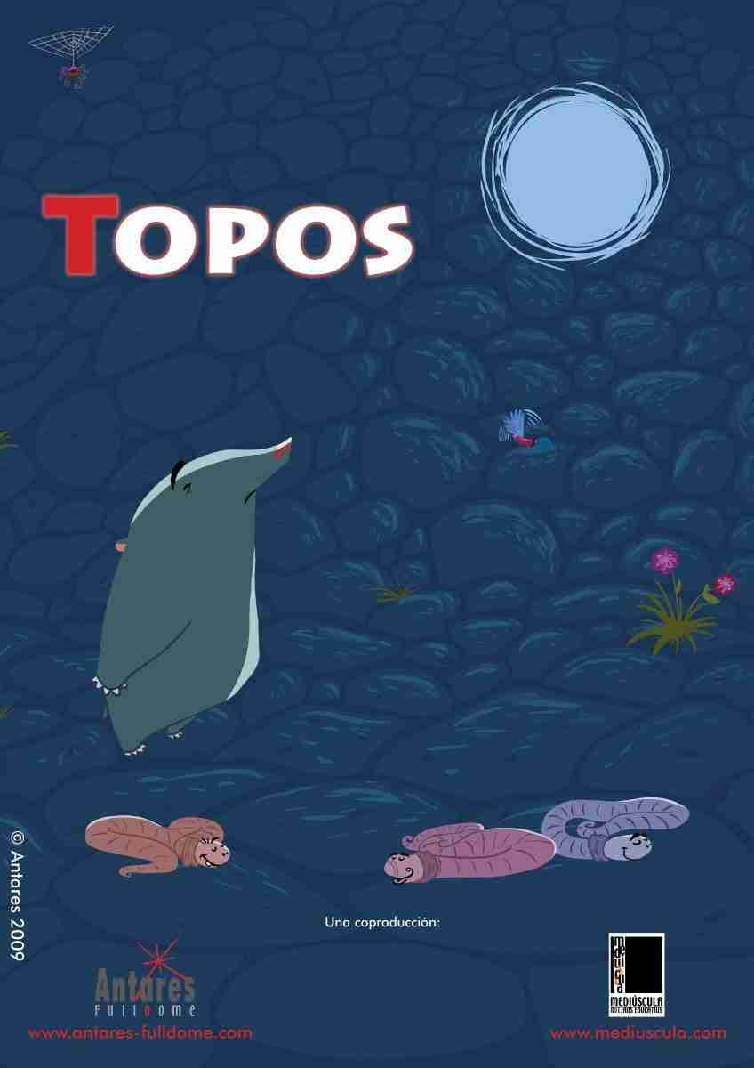 “Topos, ¿quién vive ahí fuera?” es una película a pantalla completa, producida por Antares Fulldome, cuyo objetivo es acercar a los más pequeños conceptos básicos sobre la naturaleza y la astronomía. Platón, un pequeño topo que vive en las profundidades de la tierra junto a sus padres, es el protagonista del programa. Curioso y aventurero, Platón se siente fascinado por la luz que penetra a través de la entrada de su casa… ¿De dónde viene? ¿Por qué a veces está y otras desaparece? Con el permiso de sus progenitores y acompañado de sus amigos Alfa, Beta y Gamma, y de su maestro Sócrates, Platón saldrá al exterior donde, por fin, conseguirá aclarar todas sus dudas. Así y de la mano del pequeño explorador, los asistentes descubrirán qué es el día y la noche, el Sol, la Luna y las estrellas; además de aprender conceptos básicos sobre la contaminación lumínica. Este original programa, que integra la narrativa tradicional y los medios digitales, destaca por la belleza y simplicidad de su diseño visual. Por otro lado, la expresividad de sus personajes y la banda sonora de la cinta, formada por canciones pegadizas y letras sugerentes, conseguirán mantener despierta, en todo momento, la atención de los pequeños asistentes.