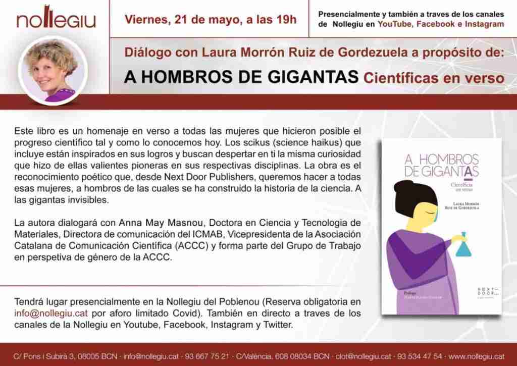 📣 ¡Atención! El próximo 21/05 a las 19h presentamos 📖 ‘A hombros de gigantas’ de @lauramorron en la librería @Nollegiu (Poblenou). Nos acompañará @amaymasnou vicepresidenta de @ACCC_ ¡Os esperamos!🎉