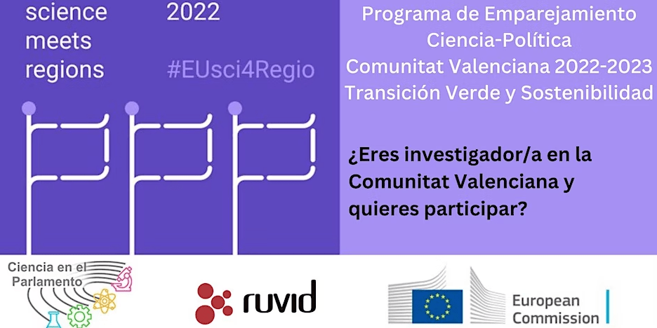 A iniciativa de la asociación de ámbito estatal Ciencia en el Parlamento (CeeP) y en colaboración con RUVID (Red de Universidades Valencianas para el fomento de la Investigación, el Desarrollo y la Innovación), la Comunitat Valenciana ha sido una de las regiones seleccionadas para implementar el programa de emparejamiento Science Meets Regions, con el título “Comunitat Valenciana 2023: Transición verde y sostenibilidad”.