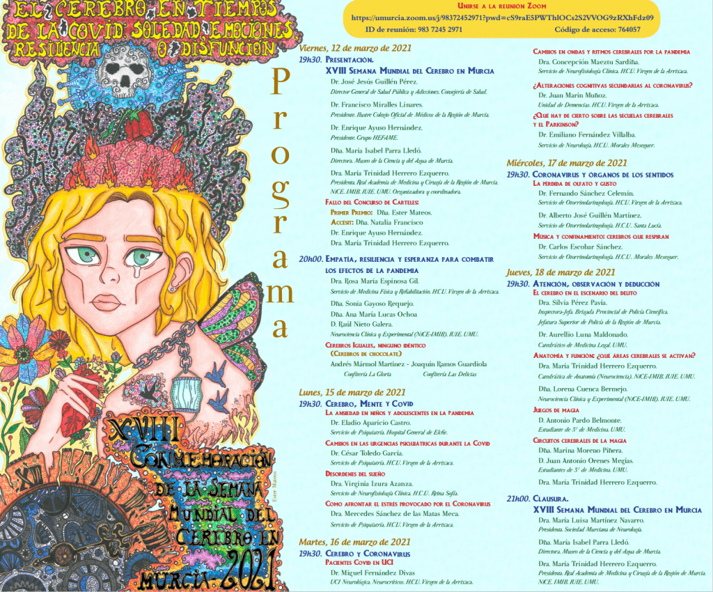 Por último el jueves 18 contaremos con algunas intervenciones sobre cómo actúa el cerebro en los lugares de delitos o en los juegos de magia. La clausura será también ese mismo día y contará con la Dra. María Luisa Martínez Navarro, presidenta de la Sociedad Murciana de Neurología, Dña. María Isabel Parra Lledó, directora del Museo de la Ciencia y del Agua de Murcia y la Dra. María Trinidad Herrero Ezquerro. Presidenta dela Real Academia de Medicina y Cirugía de la Región de Murcia.