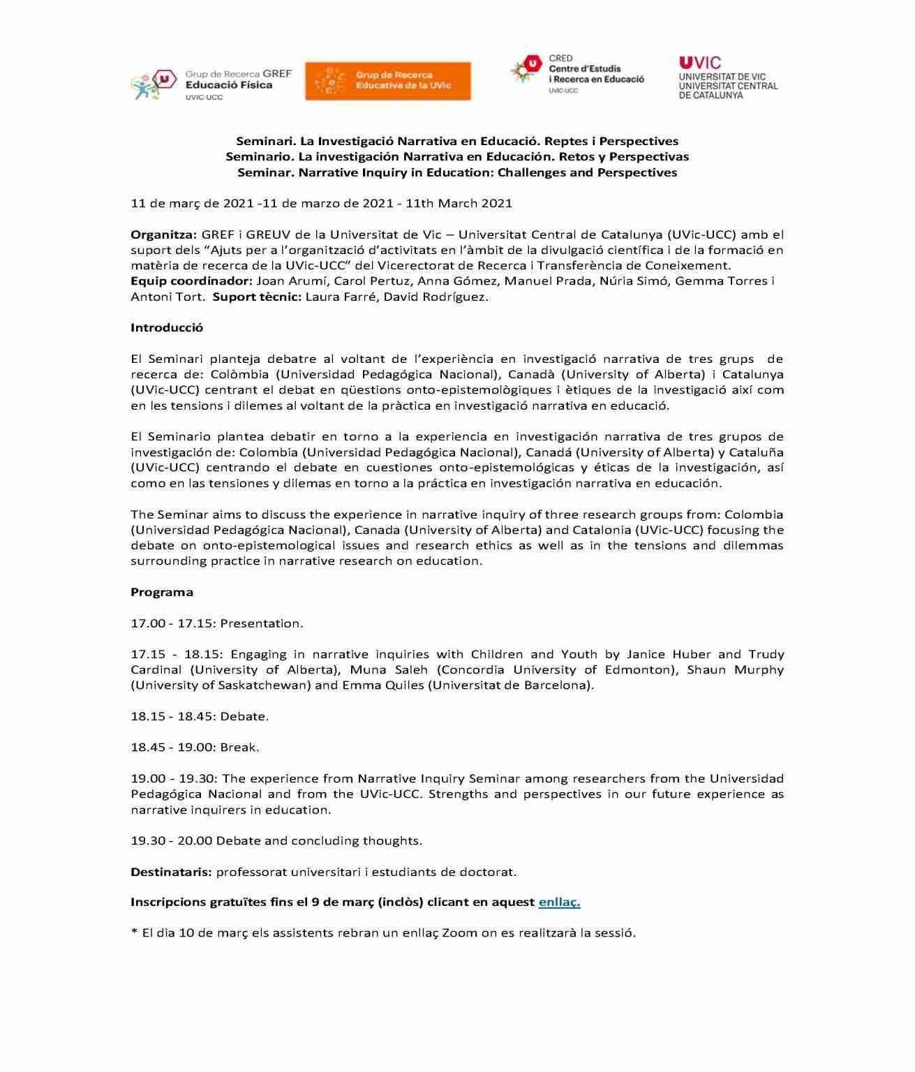 The Seminar aims to discuss the experience in narrative inquiry of three research groups from: Colombia (Universidad Pedagógica Nacional), Canada (University of Alberta) and Catalonia (UVic-UCC) focusing the debate on onto-epistemological issues and research ethics as well as in the tensions and dilemmas surrounding practice in narrative research on education.