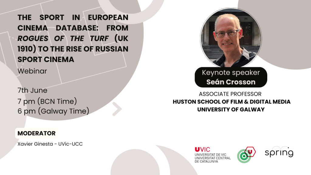 El próximo seminario-web coorganizado entre el GR TRACTE, el Departamento de Comunicación de la FEC y la Red de investigación SPRING tendrá lugar el miércoles 7 de junio y lleva por título “The Sport in European Cine Database: from Rogues of the Turf (UK 1910) to the rise of Russian Sport Cinema”.